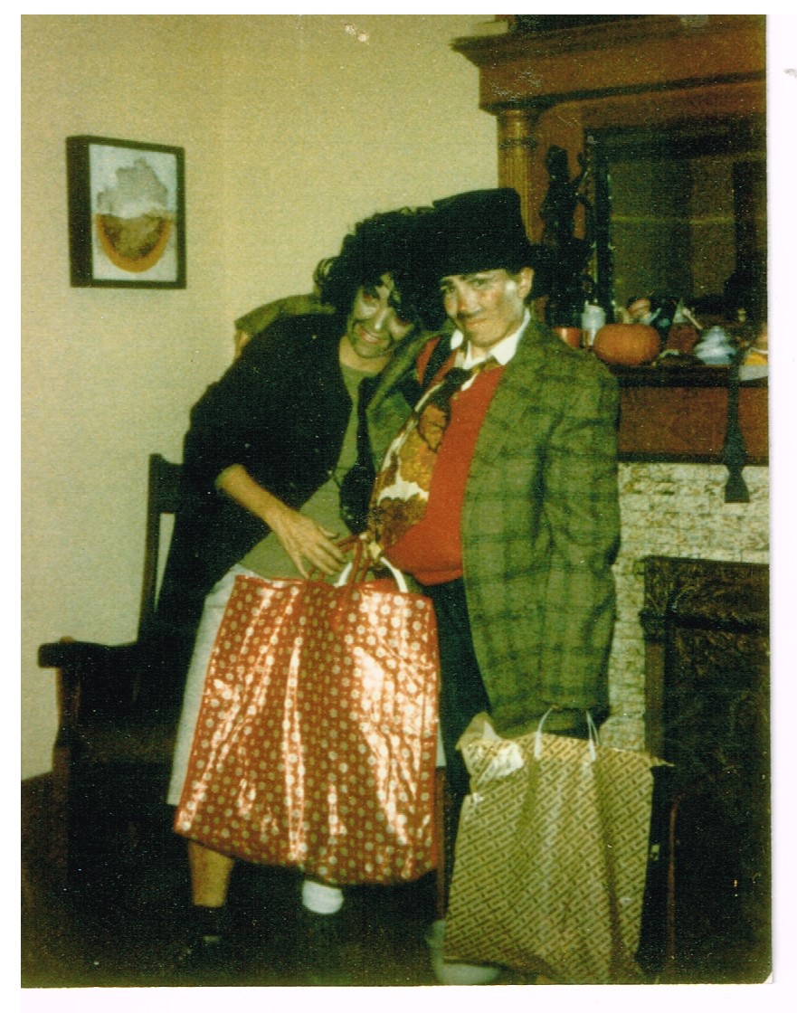 Since we both are short, barely breaking five feet, we weren’t much bigger than the early teen rabble-rousers we saw coming to the door during the evening’s later hours. She’d supplied herself with charcoal and eyeshadow so we could disguise our faces as well as dressing herself in a wig, and shabby old clothes she’d retrieved from discards in the closet. I raided my husband’s stock of outdated outfits, we smudged coloring on our jaws like five o’clock shadow and around our eyes like weary laborers, and off we went.